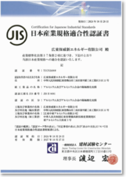 パワーウェイは、日本でJIS H4100およびJIS H8601の両認証を取得している数少ない中国企業の1つであり、品質と信頼性への取り組みを示しています。
